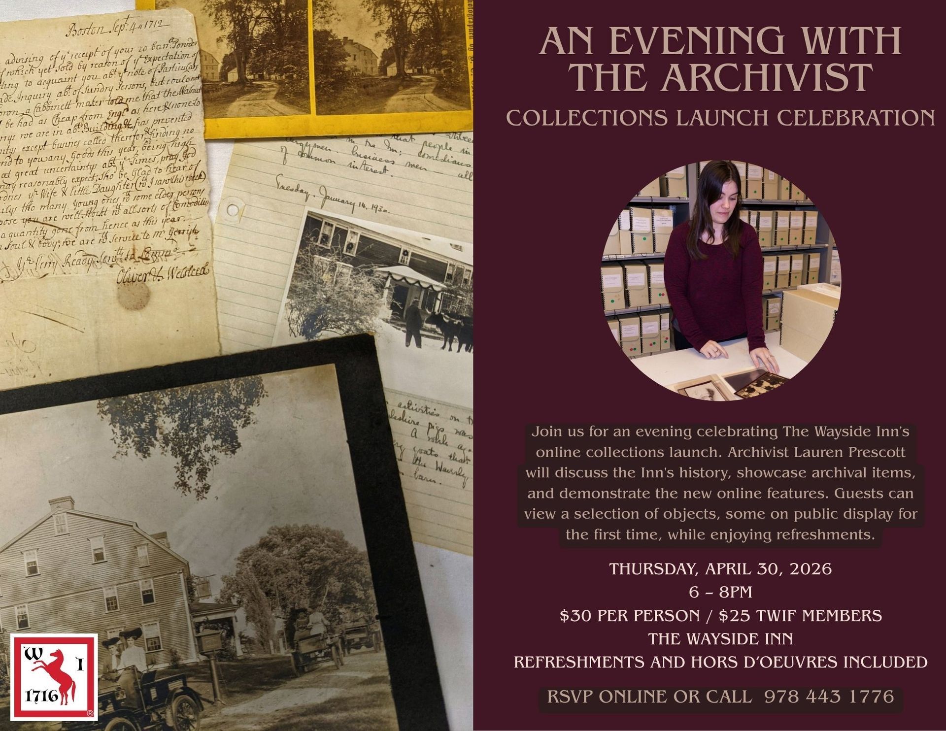 Join us for a special evening celebrating the launch of The Wayside Inn’s online collections! Archivist Lauren Prescott will give a short talk on the history of the Inn and its archives, highlighting some of the most interesting items from our collections and sharing stories from over three centuries of history. She will also discuss our years-long digitization project and demonstrate how visitors can now explore and search the Inn’s collections online.